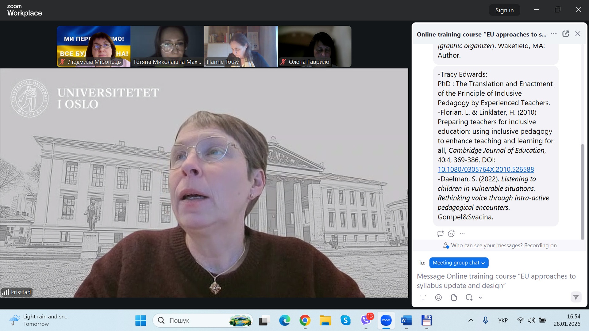 Kristine Stadskleiv from the University of Oslo (Norway) provided advice on the content and structure of the first lecture for courses at the first (bachelor's) level of higher education for preschool, primary and secondary education. She discussed each lecture in detail, commented on the positive cases presented in the content, and provided several recommendations. Overall, Ms. Kristine found the content of all lectures to be well-founded and consistent with the subject matter and structure of the courses.