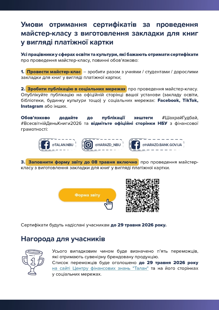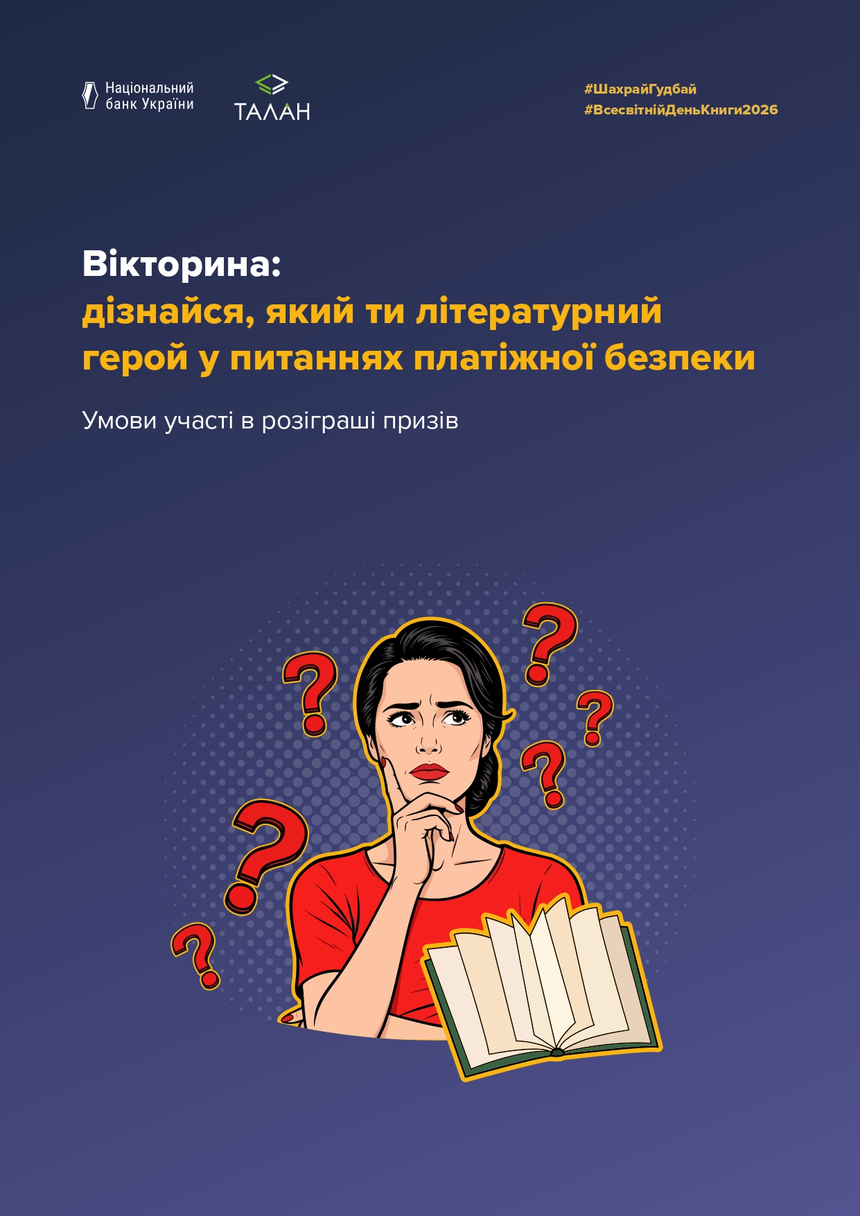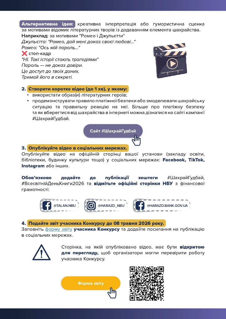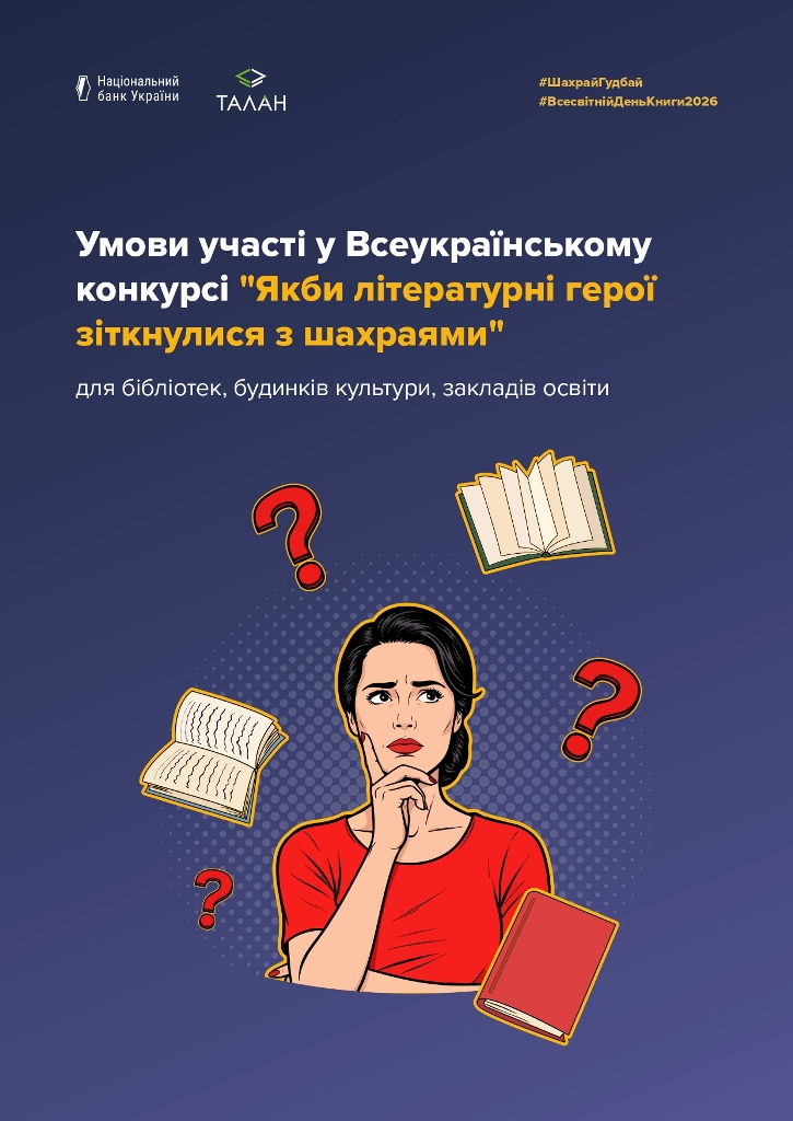 В межах проведення освітніх заходів з платіжної безпеки до Всесвітнього дня книги та авторського права, який відзначатиметься у світі 23 квітня 2026 року, Національний банк України (далі Національний банк) організовує кілька освітніх ініціатив, спрямованих на підвищення рівня знань із платіжної безпеки. Заходи будуть реалізовані в межах Всеукраїнської інформаційної кампанії з платіжної безпеки #ШахрайГудбай.