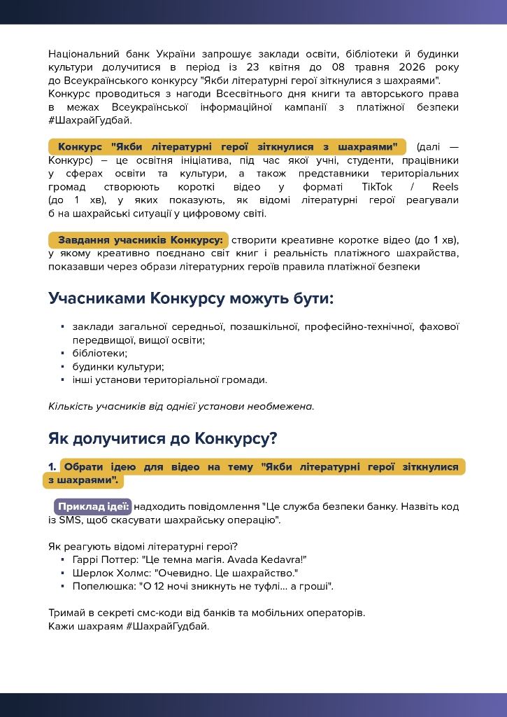 1. Конкурс "Якби літературні герої зіткнулися з шахраями" (далі - Конкурс) - це освітня ініціатива, під час якої учні, студенти, працівники у сферах освіти та культури та представники територіальних громад створюють короткі відео у форматі TikTok/Reels (до 1 хв), у яких показують, як відомі літературні герої реагували б на шахрайські ситуації у цифровому світі.