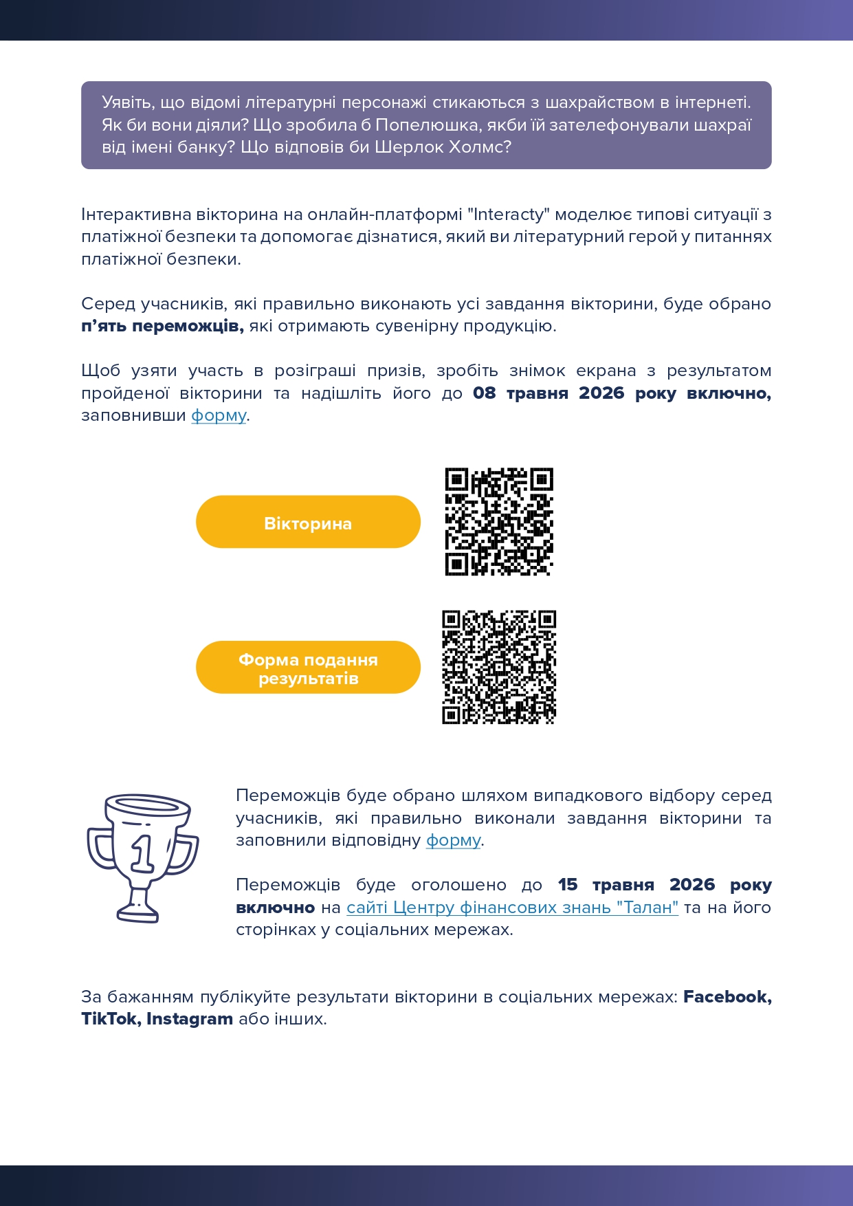 Файл, що містить посилання на вікторину та форму для заповнення для участі в розіграші призів, додається (додаток 3), також його можна переглянути за посиланням https://cutt.ly/ctFODSNm