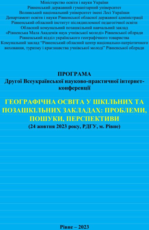 ПРОГРАМА Другої Всеукраїнської науково-практичної інтернет-конференції ГЕОГРАФІЧНА ОСВІТА У ШКІЛЬНИХ ТА ПОЗАШКІЛЬНИХ ЗАКЛАДАХ: ПРОБЛЕМИ, ПОШУКИ, ПЕРСПЕКТИВИ (24 жовтня 2023 року, РДГУ, м. Рівне)