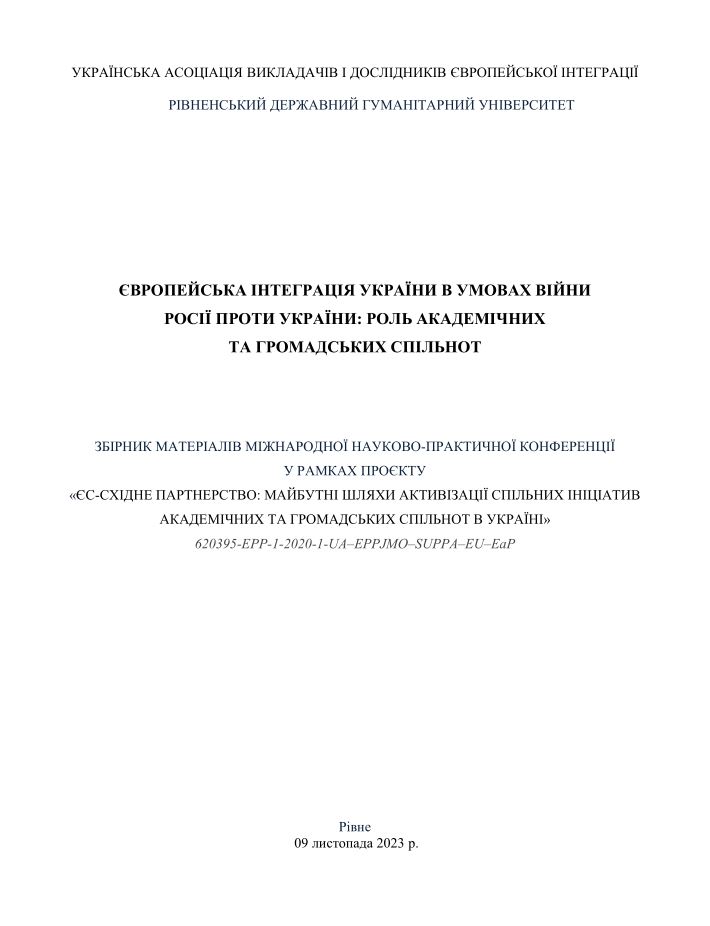 ЄВРОПЕЙСЬКА ІНТЕГРАЦІЯ УКРАЇНИ В УМОВАХ ВІЙНИ РОСІЇ ПРОТИ УКРАЇНИ: РОЛЬ АКАДЕМІЧНИХ ТА ГРОМАДСЬКИХ СПІЛЬНОТЗБІРНИК МАТЕРІАЛІВ МІЖНАРОДНОЇ НАУКОВО-ПРАКТИЧНОЇ КОНФЕРЕНЦІЇ У РАМКАХ ПРОЄКТУ