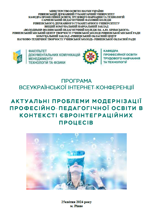 ПРОГРАМА Всеукраїнської інтернет-конференції АКТУАЛЬНІ ПРОБЛЕМИ МОДЕРНІЗАЦІЇ ПРОФЕСІЙНО-ПЕДАГОГІЧНОЇ ОСВІТИ В КОНТЕКСТІ ЄВРОІНТЕГРАЦІЙНИХ ПРОЦЕСІВ (25 квітня 2024 року)