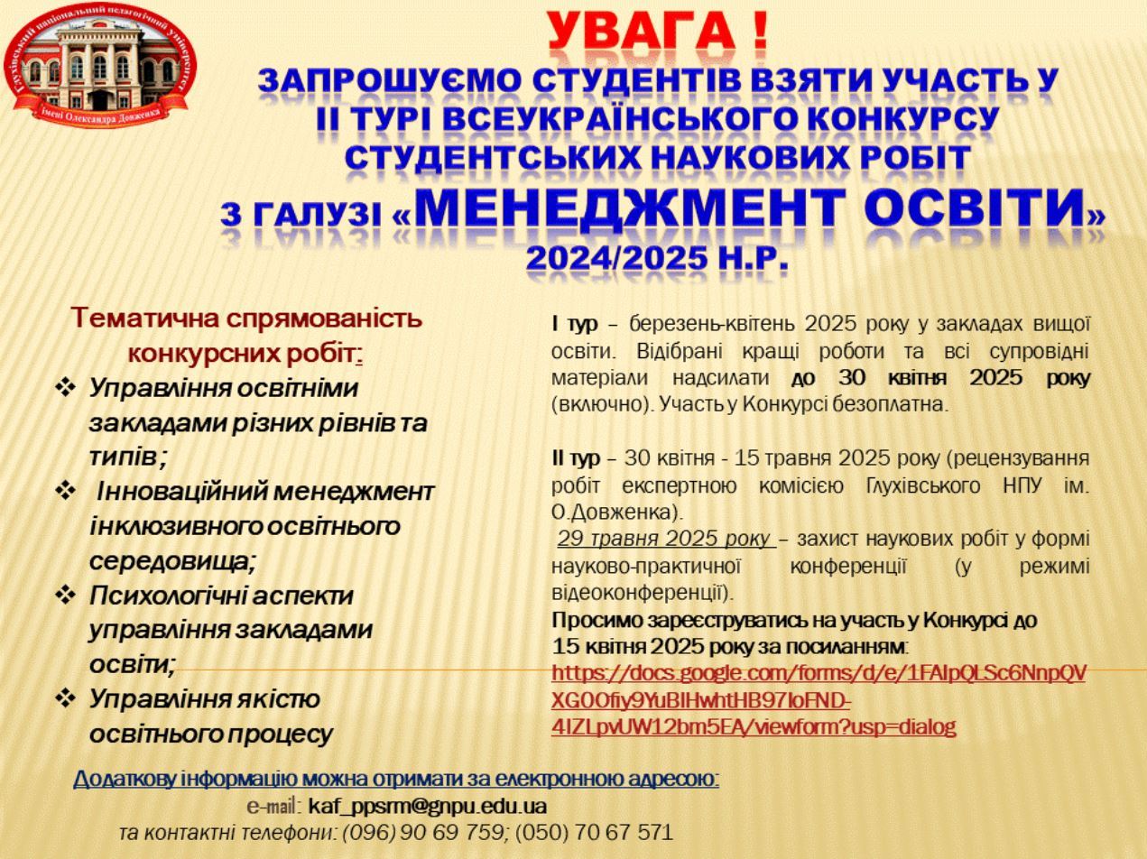 Глухівський національний педагогічний університет імені Олександра Довженка запрошує студентів українських вищих навчальних закладів взяти участь у Всеукраїнському конкурсі наукових робіт з галузі "Менеджмент освіти".