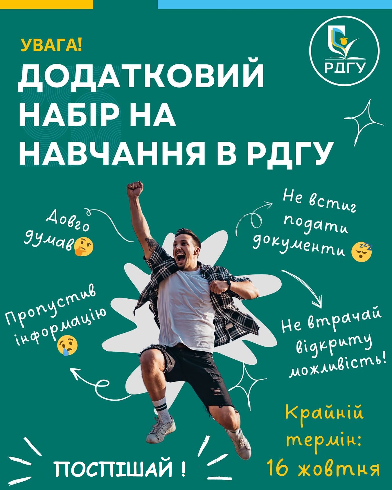 6 жовтня в Рівненському державному гуманітарному університеті стартує завершальний етап додаткового набору на контракт. Охочих навчатися на бакалавраті та в магістратурі РДГУ запрошуємо до 16 жовтня подати заяви для участі в конкурсному відборі.