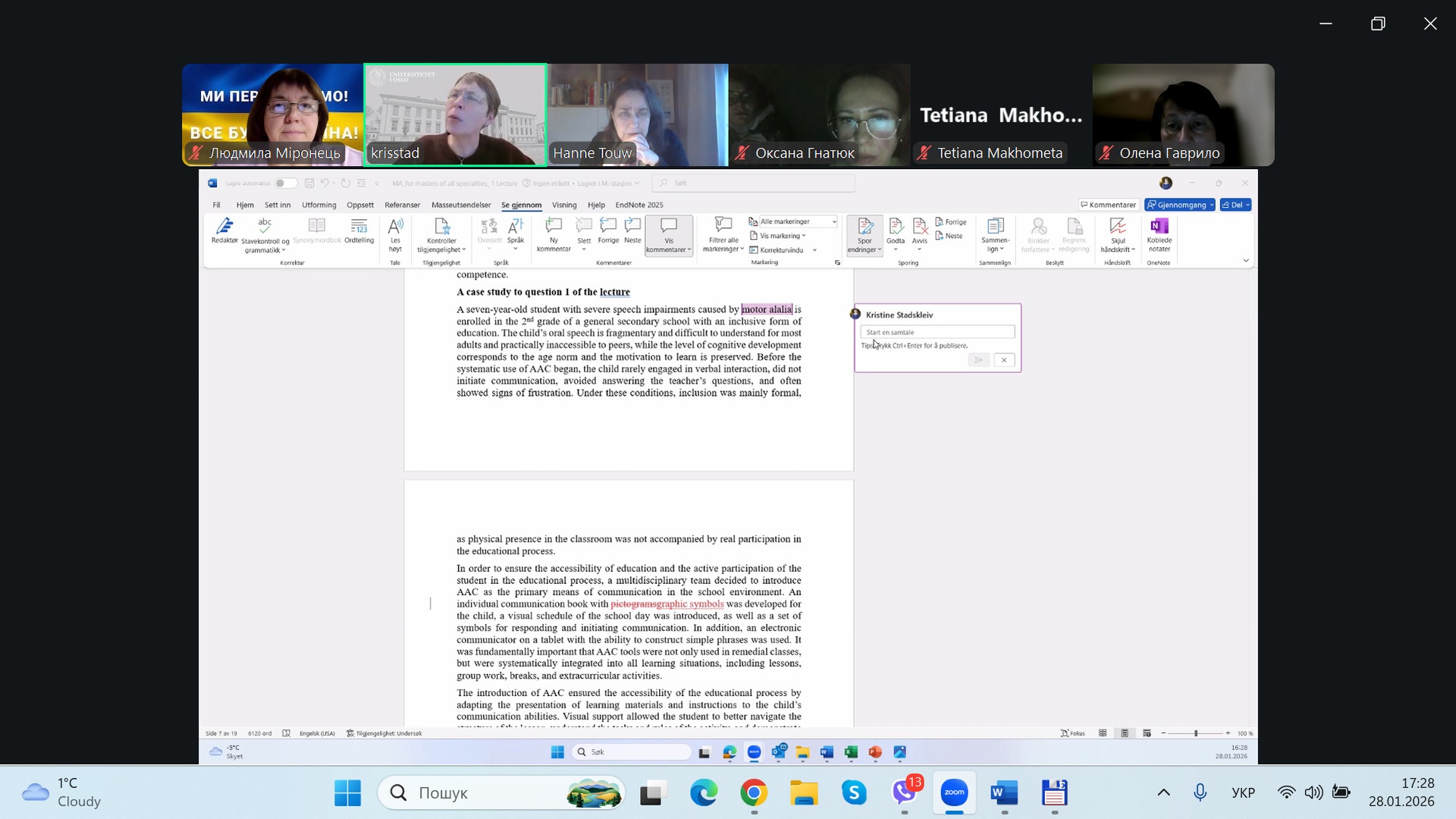 Стосовно змісту та наповнення першої лекції до курсів для першого (бакалаврського) рівня вищої освіти для дошкільної, початкової та середньої освіти консультацію провела Kristine Stadskleiv з Університету Осло (Норвегія). Вона детально зупинилася на кожній лекції, прокоментувала позитивні кейси, які наведені у змісті та надала декілька порад. Загалом зміст усіх лекцій пані Kristine визнала цілком ґрунтовним, що відповідає тематиці та структурі курсів.