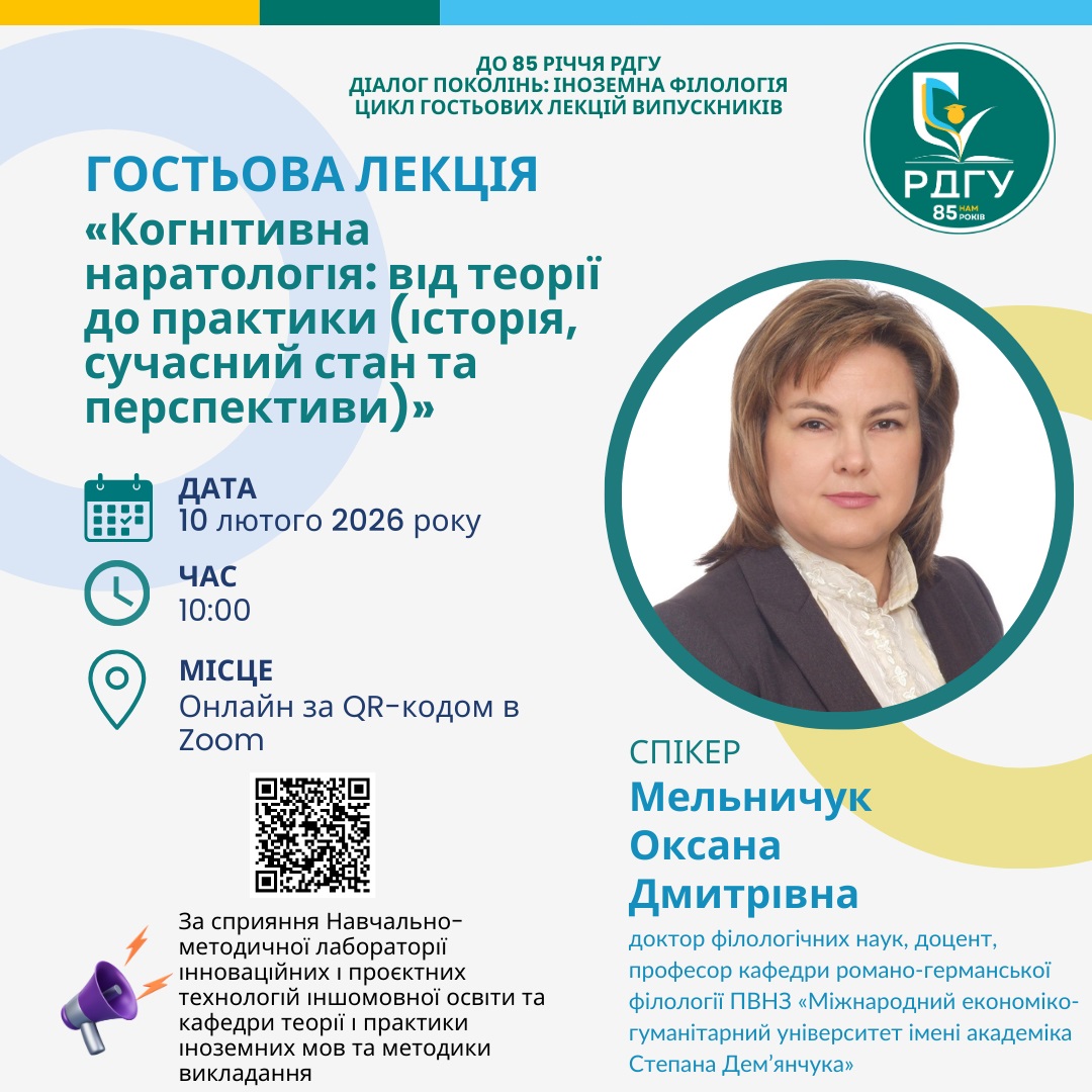 У межах відзначення 85-річчя Рівненського державного гуманітарного університету кафедра теорії і практики іноземних мов та методики викладання започаткувала цикл гостьових лекцій «Діалог поколінь: іноземна філологія». Ініціатива покликана зміцнити академічну тяглість поколінь, популяризувати наукові здобутки випускників факультету та сприяти професійному становленню здобувачів освіти.