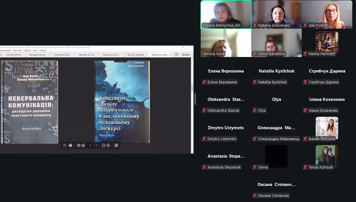 Спікеркою виступила випускниця факультету - Мельничук Оксана Дмитрівна, доктор філологічних наук, професор кафедри романо-германської філології ПВНЗ «МЕГУ імені академіка Степана Дем’янчука». У своїй доповіді лекторка ґрунтовно висвітлила сучасні підходи когнітивної наратології, зокрема взаємозв’язок когнітивної лінгвістики та психології, трактування наративу як результату ментальної діяльності людини, механізми структурування подій у свідомості та особливості інтерпретації художнього тексту. Окремий акцент було зроблено на фреймових моделях як дієвому інструменті аналізу змістової структури та виявлення імпліцитних сенсів у тексті.