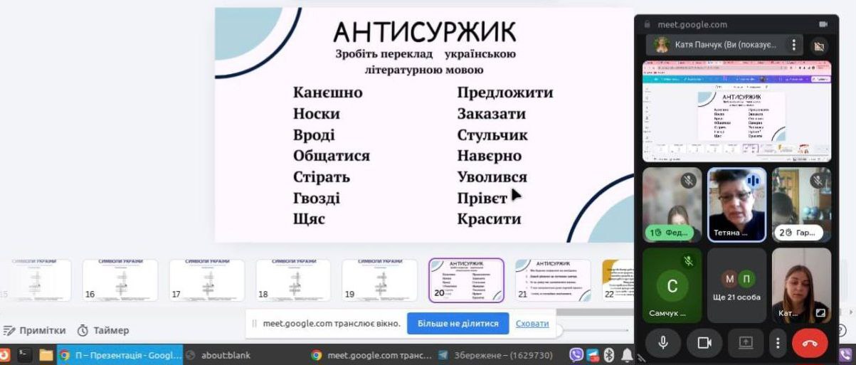 Студентка Панчук Катерина (спеціальність «Середня освіта (Українська мова і література») під час проходження виробничої практики на базі Рівненського ліцею № 13 провела мовний захід, присвячений Міжнародному дню рідної мови. Учні 6-В класу взяли активну учать у бліц-вікторині «Ми знаємо українську мову» та мовному батлі «Антисуржик». У процесі роботи застосовувалися інтерактивні методи навчання: мовна гра, командна робота, творче завдання. Мета заходу – поглиблення знань учнів про багатство й самобутність української мови.
