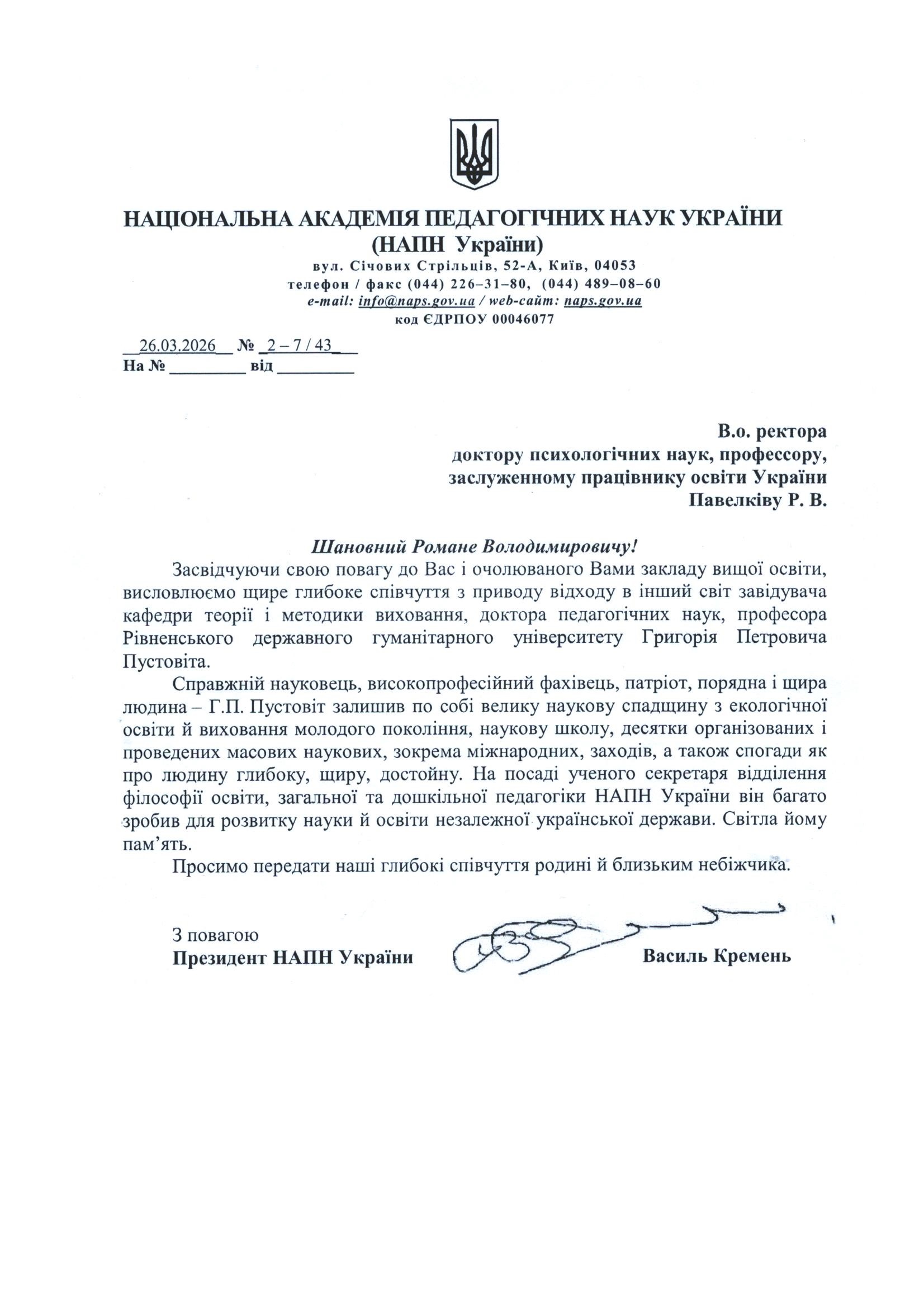 26 березня 2026 року пішов з життя доктор педагогічних наук, професор, заслужений діяч науки і техніки України, завідувач кафедри теорії і методики виховання Рівненського державного гуманітарного університету Григорій Петрович Пустовіт.