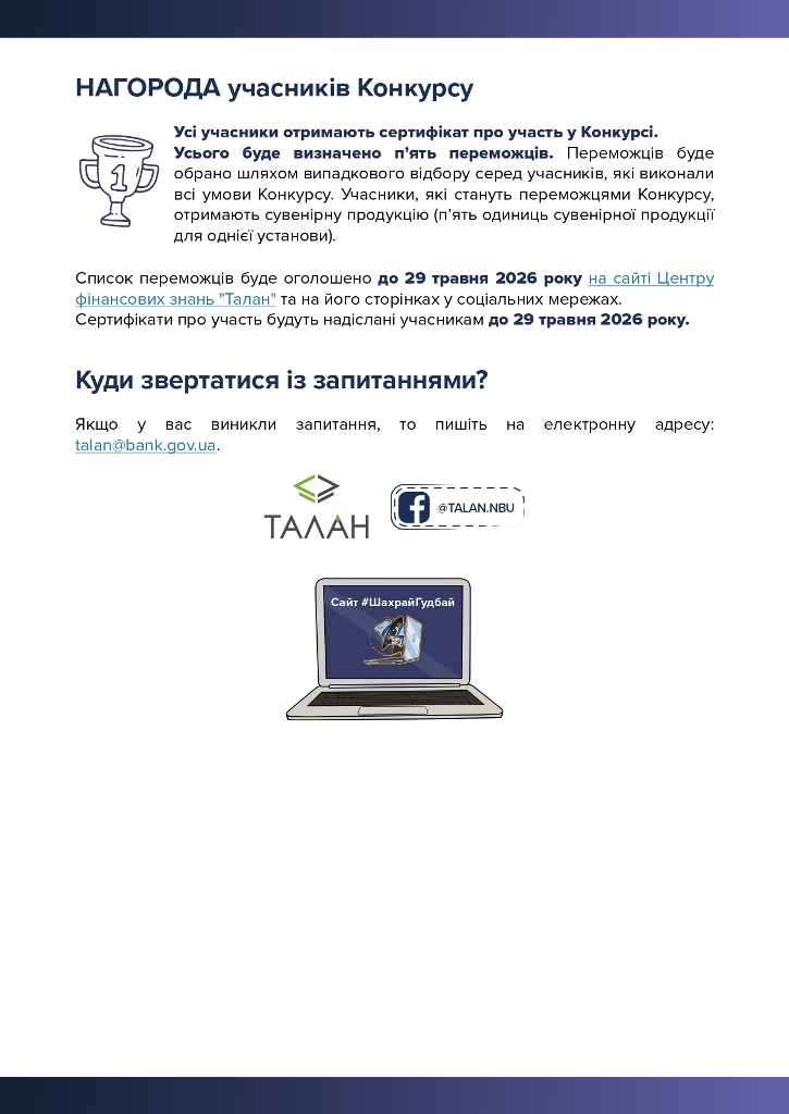 Усі учасники отримають сертифікати про участь у Конкурсі. Також шляхом випадкового відбору серед учасників, які виконали всі умови, буде визначено п'ять переможців. Вони отримають сувенірну продукцію.
