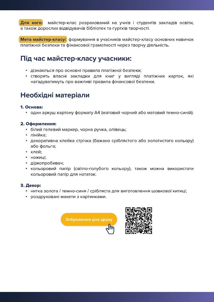 це освітня ініціатива, під час якої учасники дізнаються про основні правила платіжної безпеки та створюють власні закладки для книг у вигляді платіжних карток, які нагадуватимуть про важливі правила фінансової безпеки.