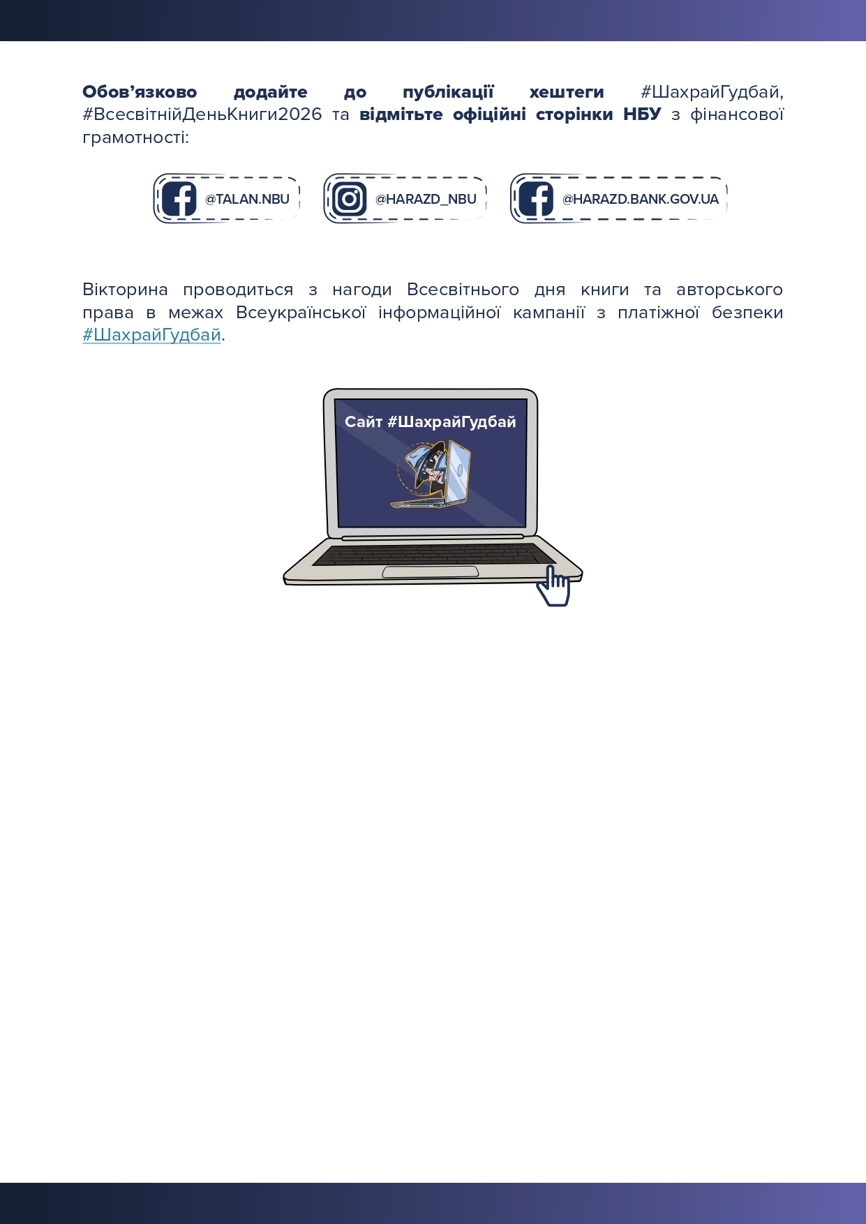 В межах проведення освітніх заходів з платіжної безпеки до Всесвітнього дня книги та авторського права, який відзначатиметься у світі 23 квітня 2026 року, Національний банк України (далі Національний банк) організовує кілька освітніх ініціатив, спрямованих на підвищення рівня знань із платіжної безпеки. Заходи будуть реалізовані в межах Всеукраїнської інформаційної кампанії з платіжної безпеки #ШахрайГудбай.