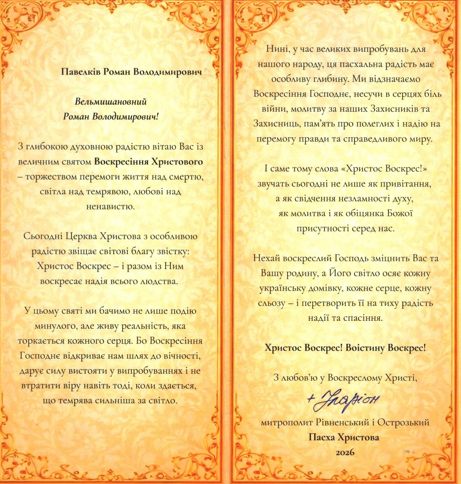 Бажаю вам і вашим родинам міцного здоров’я, душевного спокою, добробуту та невичерпної енергії для нових звершень. Нехай у кожній оселі панують злагода, мир і достаток, а віра додає впевненості у завтрашньому дні.