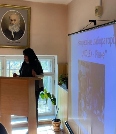 Під час заходу керівник лабораторії доц. Н.В. Гаврилюк та її заступник доц. Н.А. Адах розповіли здобувачам освіти про засновницю неографічної лабораторії – проф. Г.М. Вокальчук, основні напрями роботи її членів. Ліцеїсти ознайомилися зі словниками авторських лексичних новотворів поетів ХХ ст. Такі лексикографічні праці сприяють вихованню мовно-естетичних смаків у сучасної молоді, розширюють знання користувачів про невичерпні словотворчі ресурси української мови.