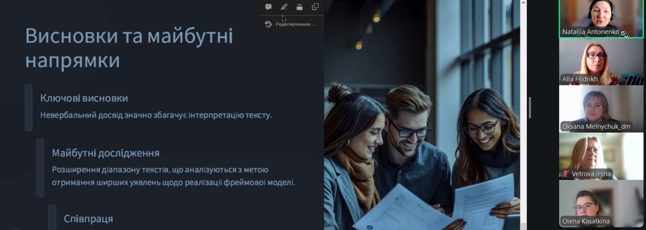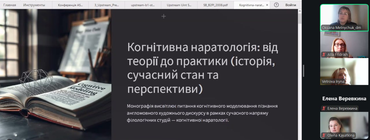 Спікеркою виступила випускниця факультету - Мельничук Оксана Дмитрівна, доктор філологічних наук, професор кафедри романо-германської філології ПВНЗ «МЕГУ імені академіка Степана Дем’янчука». У своїй доповіді лекторка ґрунтовно висвітлила сучасні підходи когнітивної наратології, зокрема взаємозв’язок когнітивної лінгвістики та психології, трактування наративу як результату ментальної діяльності людини, механізми структурування подій у свідомості та особливості інтерпретації художнього тексту. Окремий акцент було зроблено на фреймових моделях як дієвому інструменті аналізу змістової структури та виявлення імпліцитних сенсів у тексті.