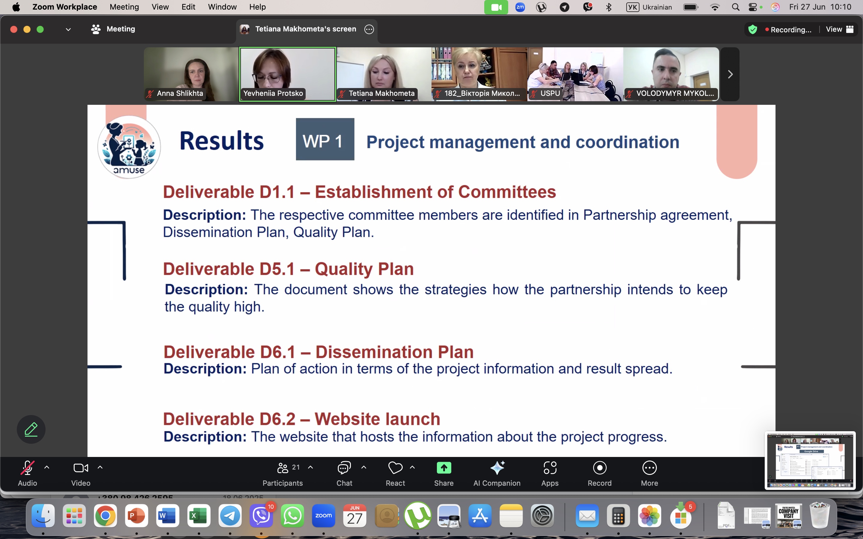 - Представлено результати виконаних завдань у межах WP1 та узгоджено план дій на наступні 6 місяців;