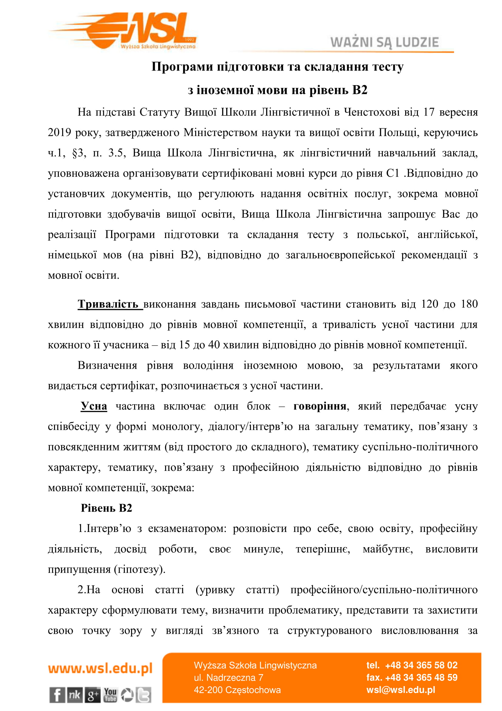 Вища Школа Лінгвістична (WSL) організовує програми «Науково-педагогічне стажування для викладачів українських ВНЗ» та «Програми з підготовки та складання тесту з іноземної мови на рівень В2» з 25.01.2021 року до 28.01.2021 року.