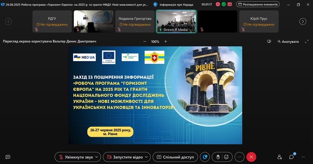 26–27 червня 2025 року у місті Рівне відбувся інформаційний захід «Робоча програма «Горизонт Європа» на 2025 рік та гранти Національного фонду досліджень України – нові можливості для українських науковців та інноваторів». До заходу, присвяченому новим можливостям для українських науковців, інноваторів і дослідників у рамках Програми «Горизонт Європа» на 2025 рік, а також грантовим можливостям, які пропонує сам НФДУ, долучилися викладачі Рівненського державного університету: проф. Петренко О.Б., проф. Шліхта Г.О., проф. Виткалов С.В., проф. Лисиця А.В., доц. Герасимчук Т.Ф., доц. Михальчук Р.Ю., доц. Баліка Л.М., доц. Ногачевська І.О., Коваль К.Ю., Григорук В.О.