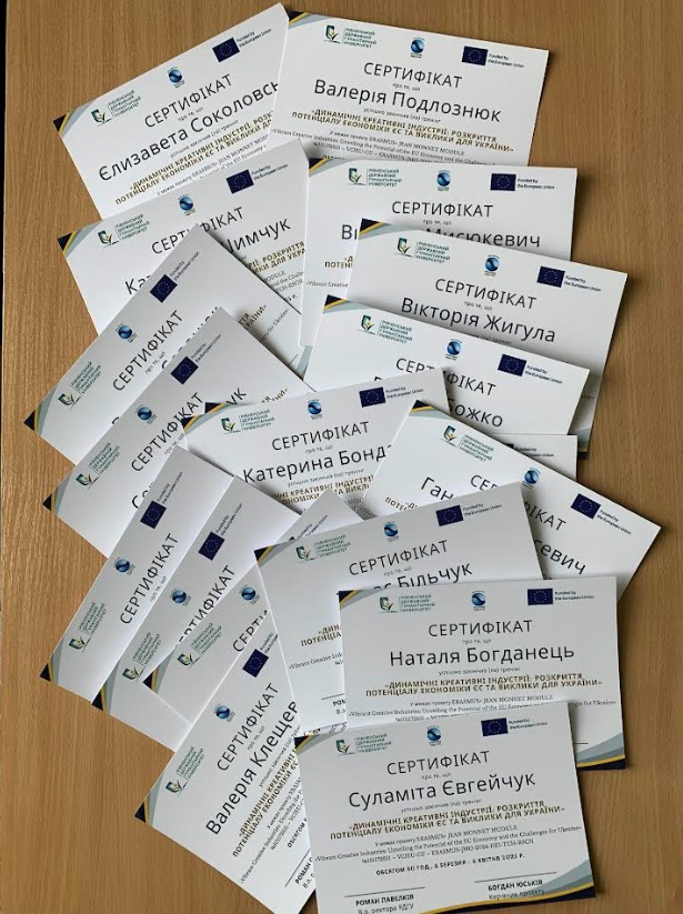 Центральною частиною нашої роботи стали дві навчальні сесії, що відбулися навесні 2025 року. Слухачів – 22 студенти і аспіранти на першій сесії і 31 підприємець, представник навчальних закладів і креативних професій на другій сесії – занурилися в інтенсивний курс, що охоплював понад 60 годин лекцій. Обговорювали не тільки базові поняття креативної економіки, а й досвід ЄС, трансформацію бізнесу, цифровізацію, штучний інтелект, стартапи, бренди, соціальне підприємництво. Лекції читали як викладачі РДГУ, так і запрошені науковці й експерти з практичним досвідом у сфері креативу та цифрових інновацій. Усі, хто пройшов курс, отримали сертифікати – але найважливіше, що отримали – це розуміння, що креатив – це серйозно і системно.