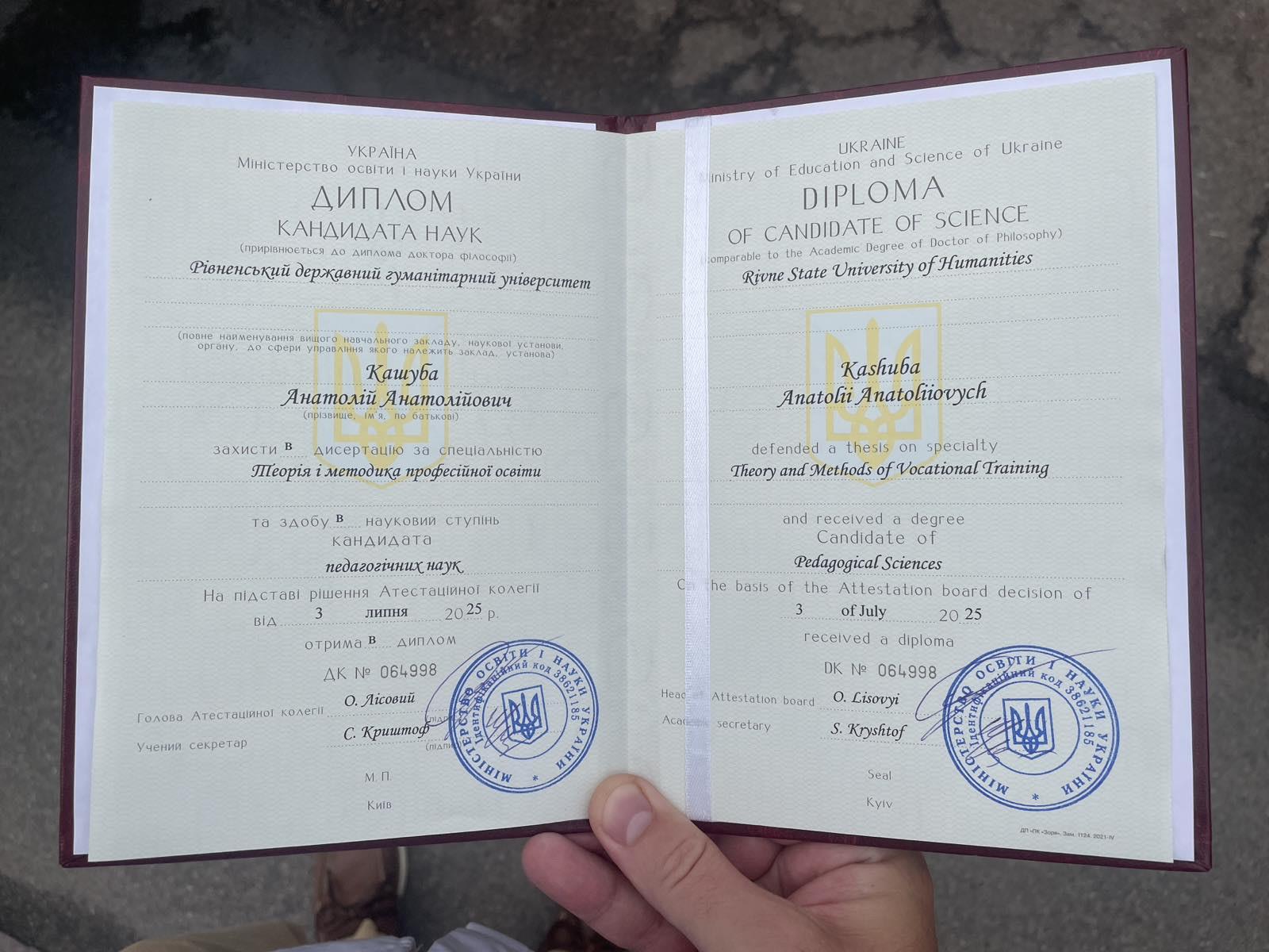 Наказом МОН України від 03.07.2025 р №962 затверджено рішення спеціалізованої вченої ради Д 47.053.01 Рівненського державного гуманітарного університету про присвоєння наукового ступеня кандидата педагогічних наук зі спеціальності 13.00.04 – теорія і методика професійної освіти Анатолію КАШУБІ – доценту кафедри теорії і практики фізичної культури і спорту