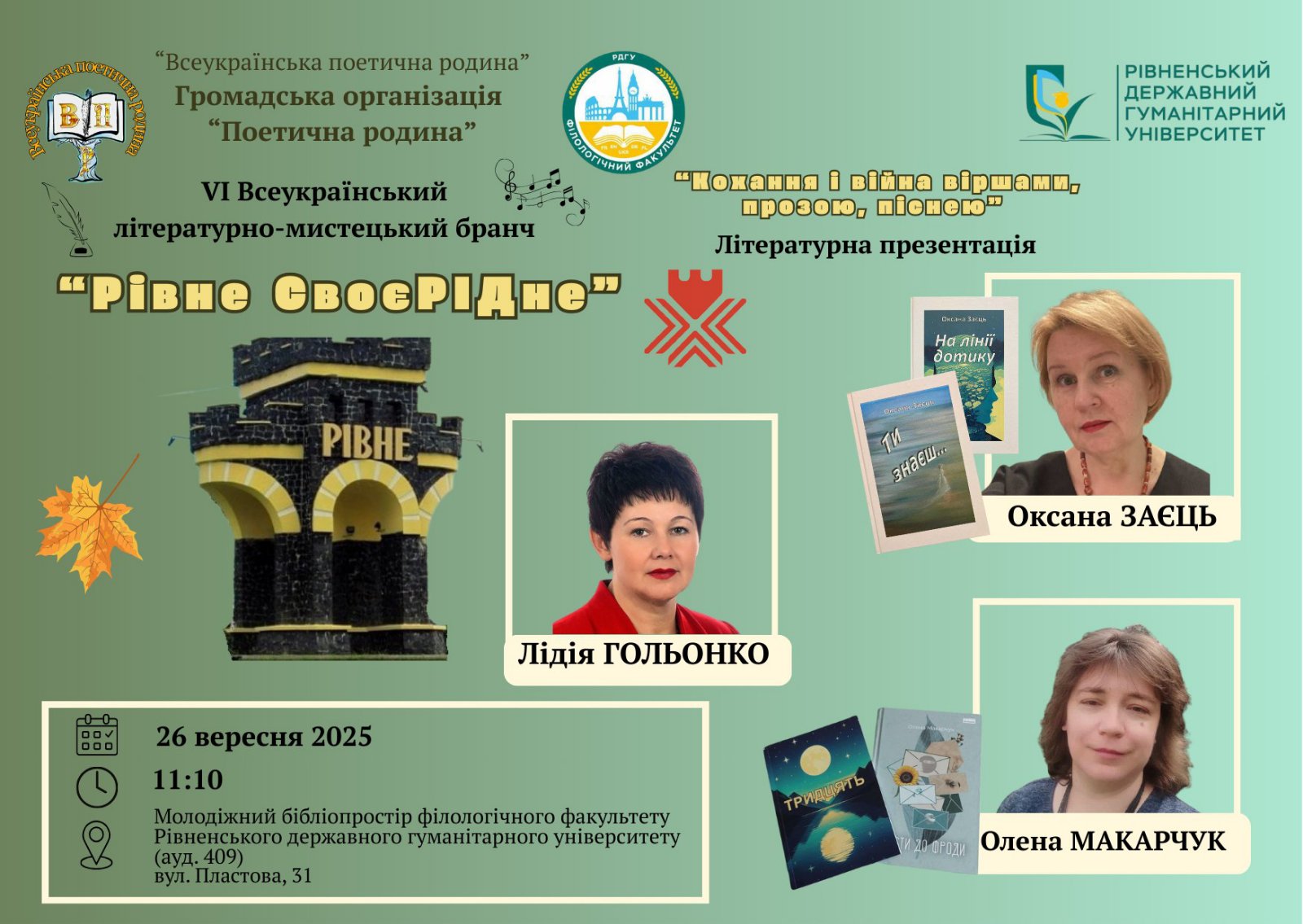 У п'ятницю, 26 вересня, на базі Рівненського державного гуманітарного університету в рамках VI Всеукраїнського літературно-мистецького бранчу «Рівне своєРІДне» відбудеться літературна презентація «Кохання і війна віршами, прозою, піснею». Творчі доробки презентуватимуть поетка й бардеса Лідія Гольонко (м. Рівне, Україна), прозаїкиня й перекладачка Олена Макарчук (м. Суми, Україна), поетка й художниця Оксана Заєць (м. Рівне, Україна; м. Прага, Чеська Республіка).