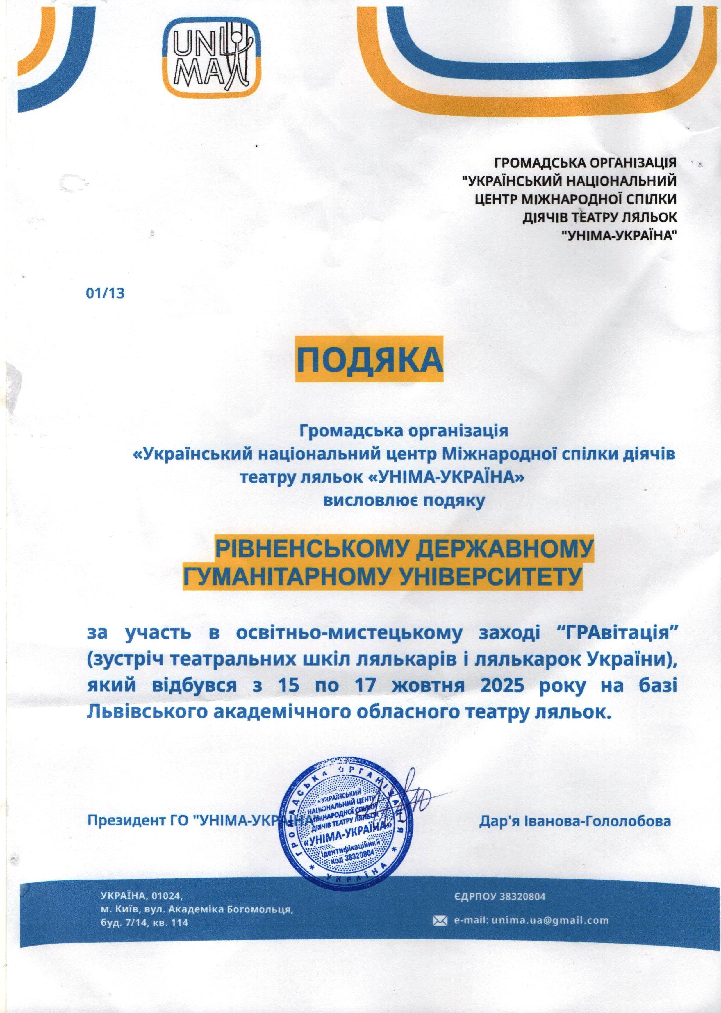 Рівненський державний гуманітарний університет отримав Подяку за активну участь здобувачів освіти кафедри театральної режисури у мистецько-освітньому заході театральних шкіл лялькарів і лялькарок.