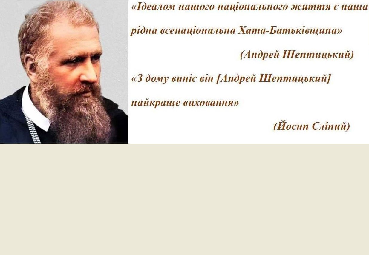 Серед плеяди великих українців, які присвятили своє життя служінню українського народу впродовж ХХ століття, особливе місце посідає постать митрополита Андрея ШЕПТИЦЬКОГО - духовного наставника, великого просвітителя, мецената, мудрого і передбачливого політика.
